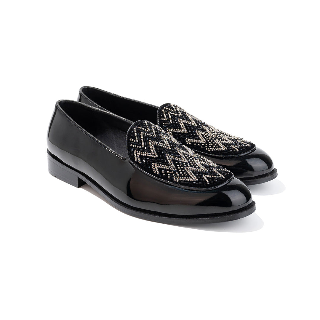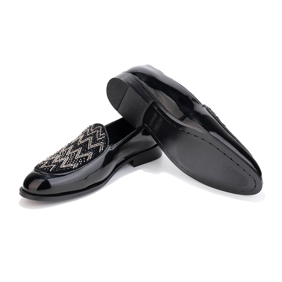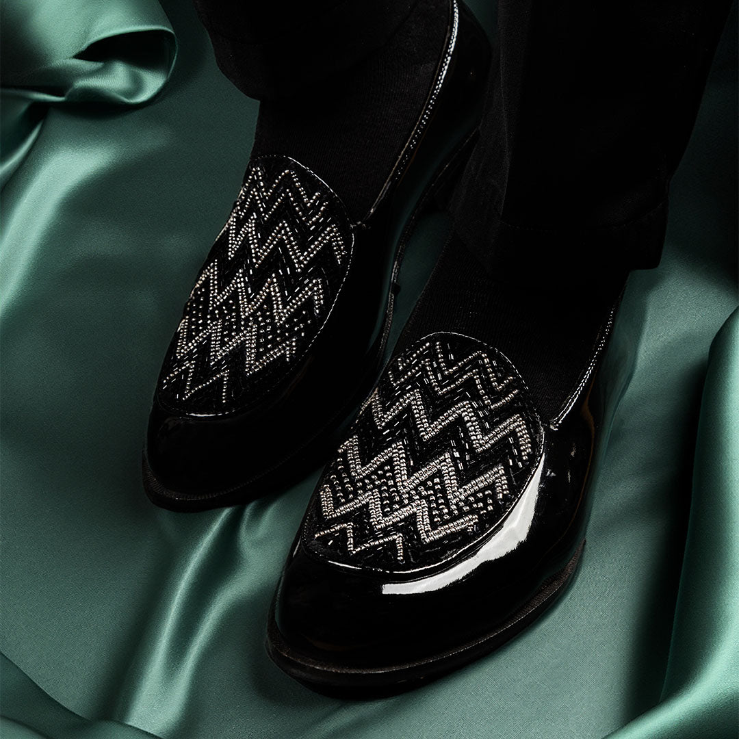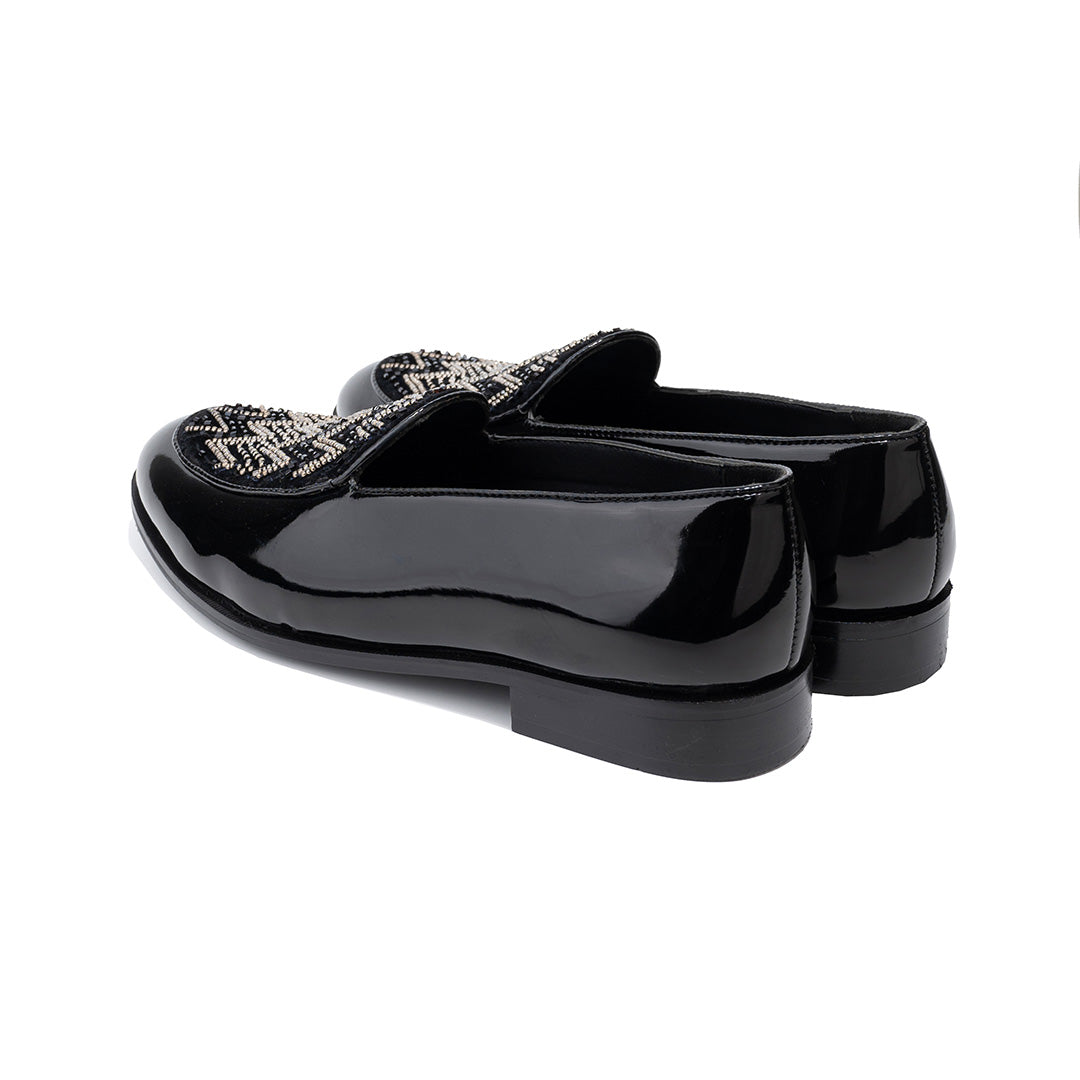 Introducing our Black Patent Slip-Ons with Chevron Bead Embellishments, designed to make a striking statement at your next party or a red carpet event. These slip-ons feature a classic black patent micro fibre adorned with intricate beadwork in a mesmerising chevron format on the upper. Each bead is meticulously placed to create visually captivating patterns, ensuring you stand out in any crowd with a touch of unique flair.