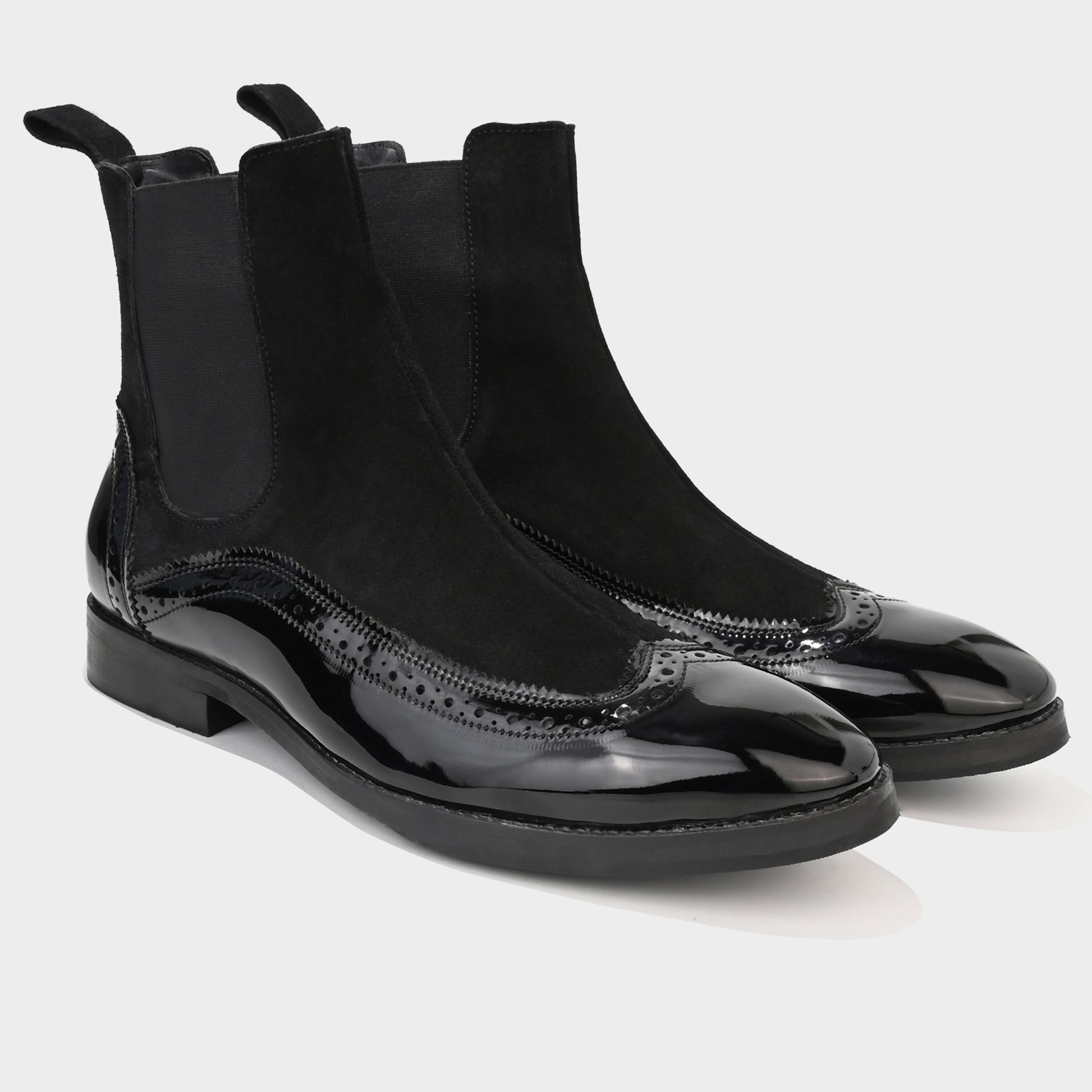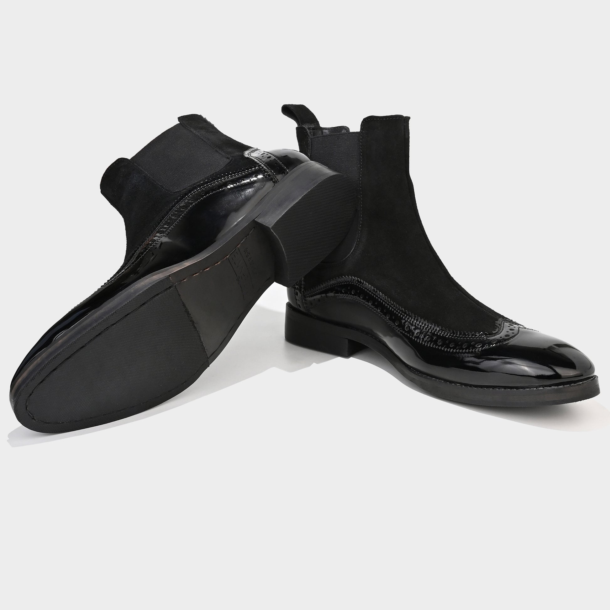 A jet black upper meets a high-shine patent toe, creating a sharp break that feels intentional, not loud. The suede-textured vegan body keeps things grounded, while the polished front adds just enough edge for evenings that call for sharper dressing. Slip-on Chelsea panels keep it easy.
