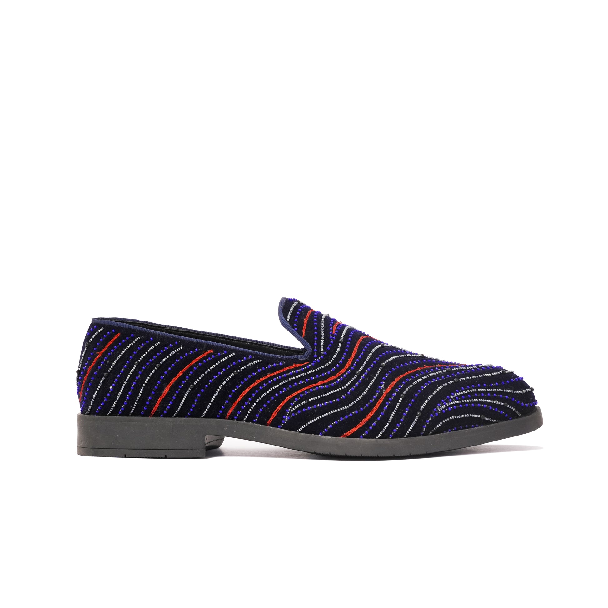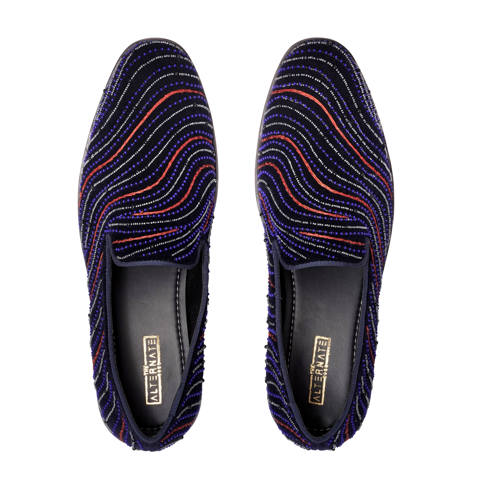 Where craftsmanship meets charisma, The Alternate’s Midnight Wave Embroidered Slip-Ons are a striking expression of modern elegance. Hand-embroidered on vegan velvet, the multi-colored wave detailing in blue and red threads adds a dynamic rhythm to the classic silhouette. Designed to stand out at weddings, cocktails and evening events.