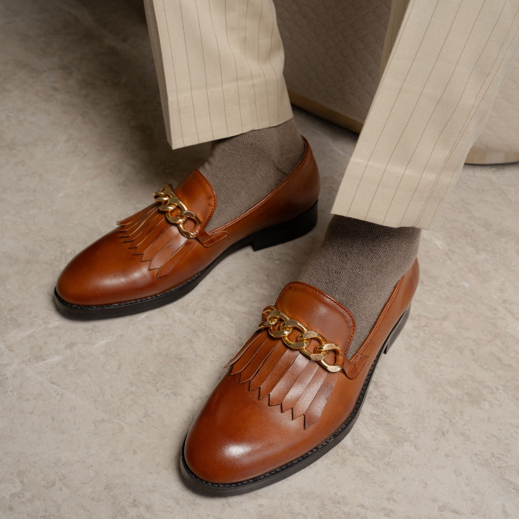 FRINGE SLIP ON WITH CHAIN DETAIL-TAN