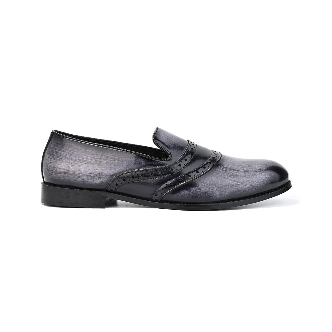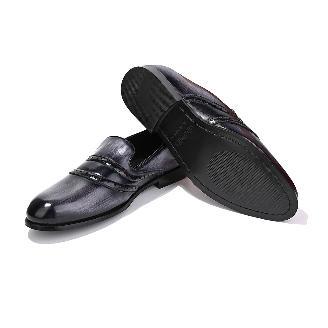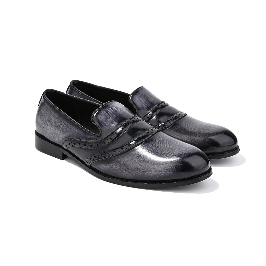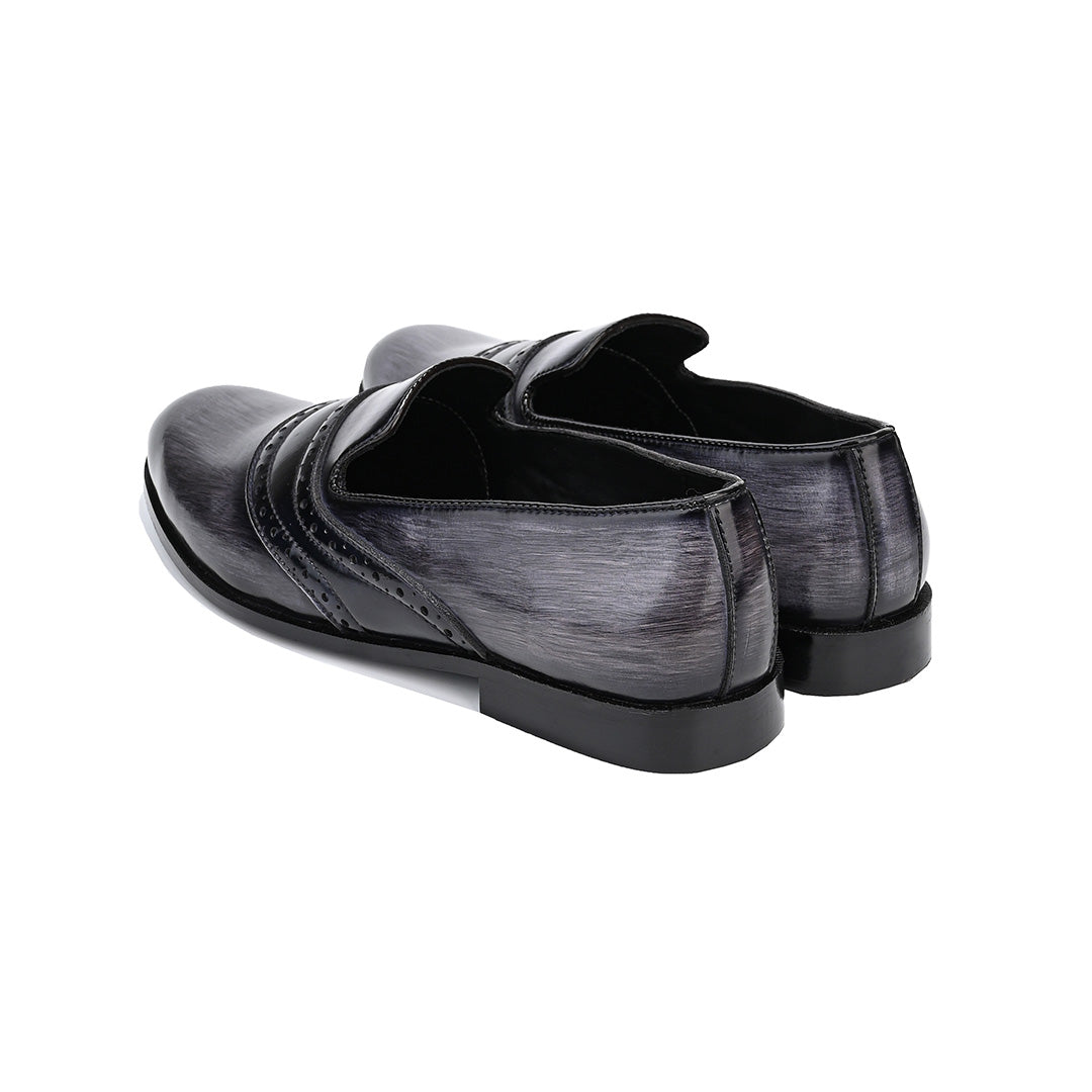 Step up your style game with our Men's Hand-Painted Grey Slip-On Shoes. Crafted by skilled experts who take immense pride in their work boasting a one-of-a-kind hand-painted finish, ensuring a unique look. The grey hue and intricate broguing detail of these slip-ons exudes understated sophistication, making them a versatile choice for any occasion. They're more than just footwear; they're a work of art for your feet.