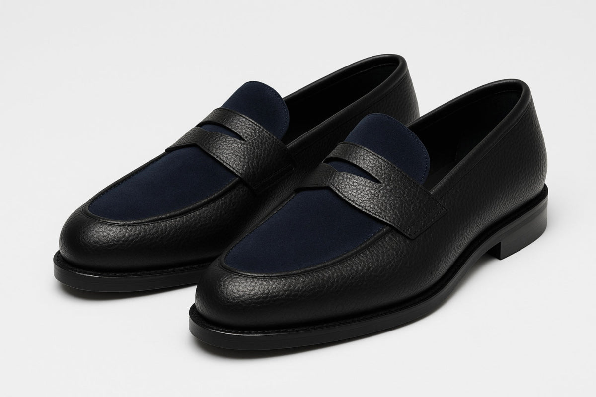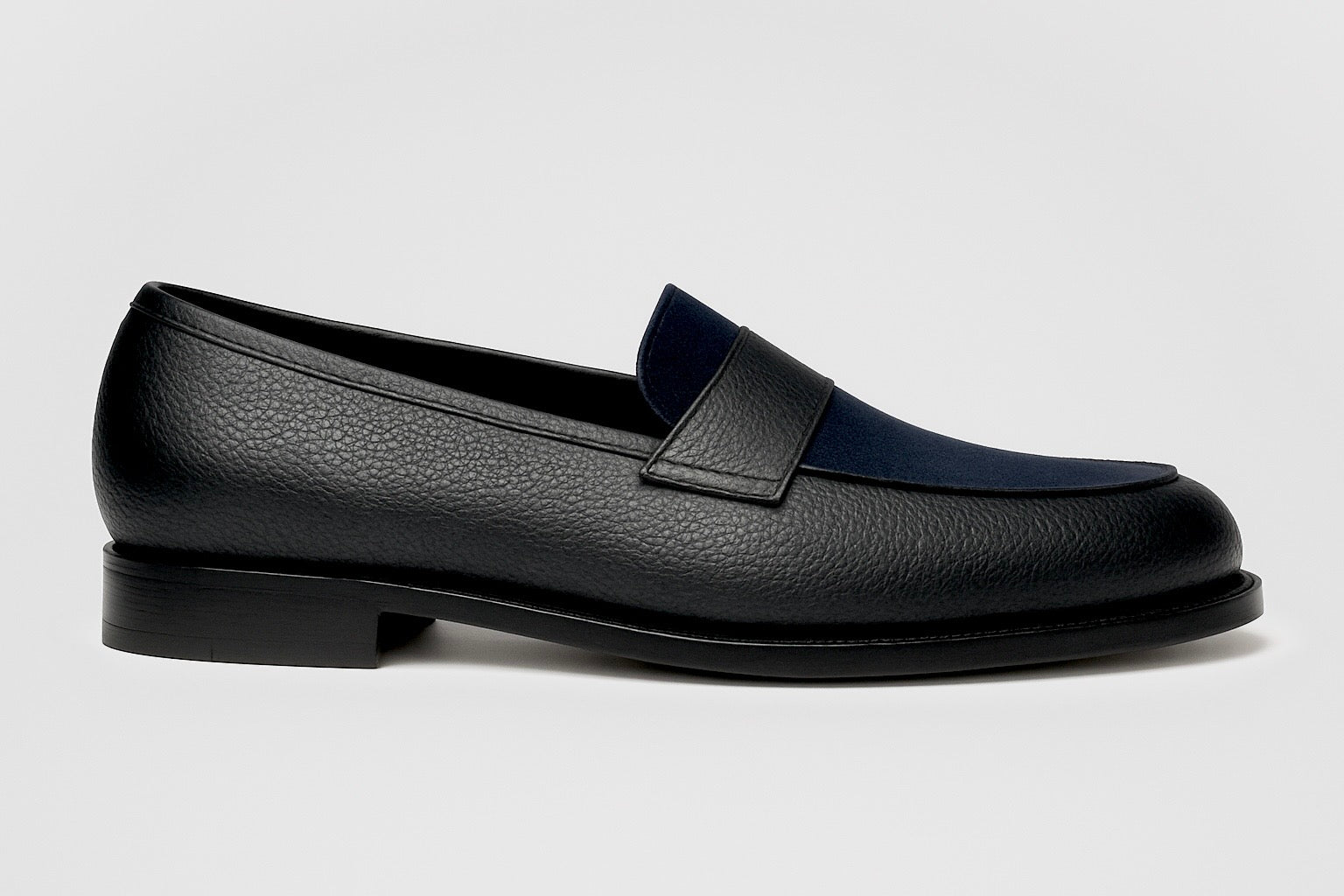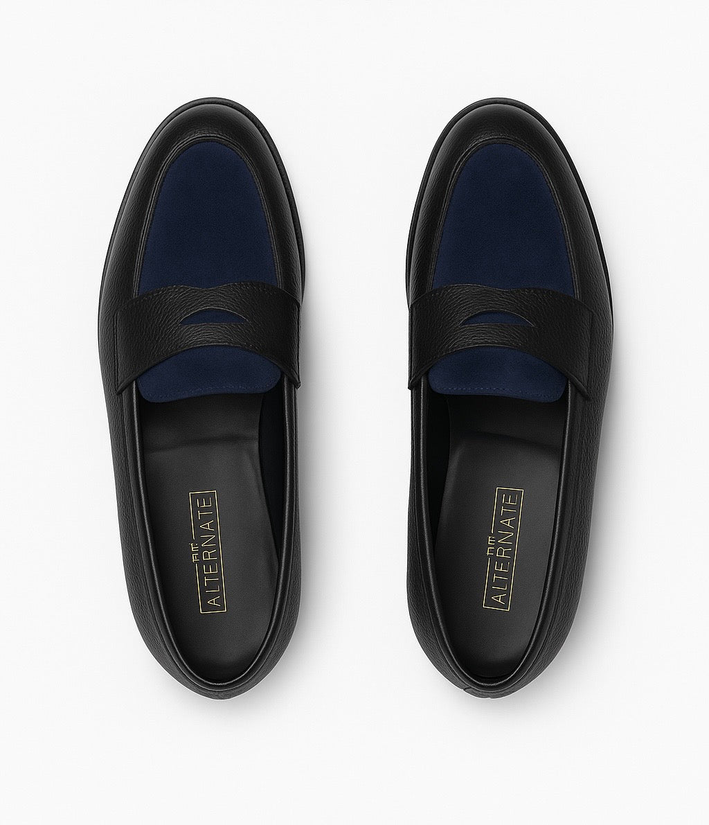 A versatile loafer designed for everyday sophistication. Crafted in milled faux leather with a midnight navy faux suede vamp, it offers a refined contrast that pairs just as well with tailored workwear as it does with denim. An edgy and entirely cruelty-free, this shoe brings comfort to daily wear without compromising on style. The cushioned insole ensures ease through long hours, while the clean silhouette keeps it sharp for any occasion.